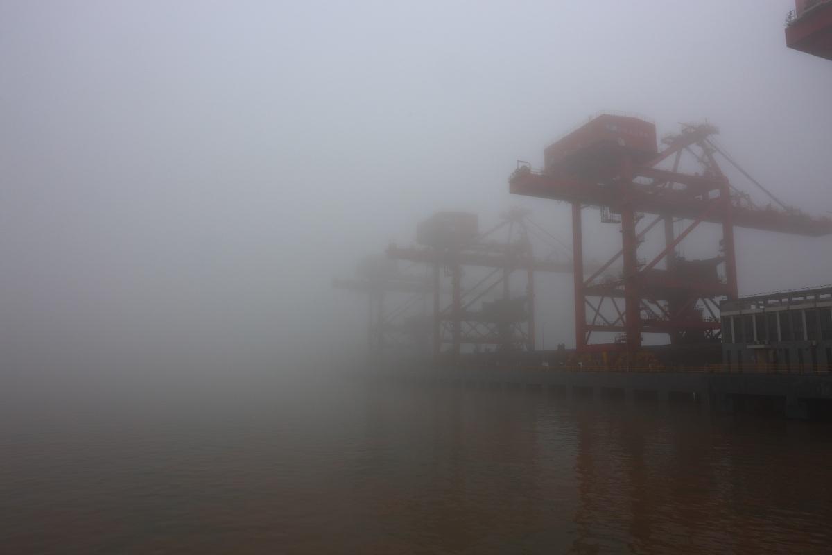 浙能港口港區(qū)大霧彌漫,如同一塊巨大的幕布。 錢威 攝