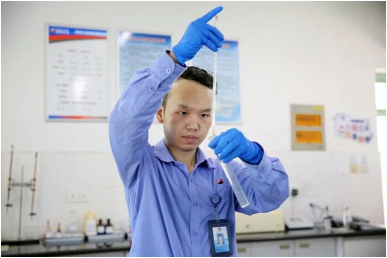 6月5日,浙能長電公司化學專業人員正在觀察中水系統處理后的水樣。