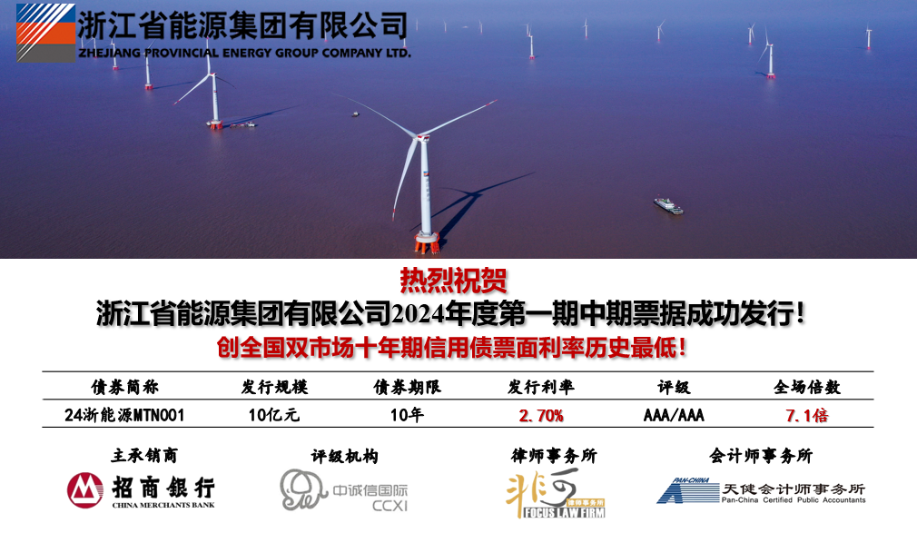 3月6日,浙能集團(tuán)成功公開發(fā)行10億元十年期中期票據(jù),票面利率2.70%。這是浙能集團(tuán)2024年在銀行間市場(chǎng)發(fā)行的首單十年期債券產(chǎn)品,創(chuàng)全國(guó)銀行間和交易所雙市場(chǎng)十年期信用債發(fā)行利率歷史最低。